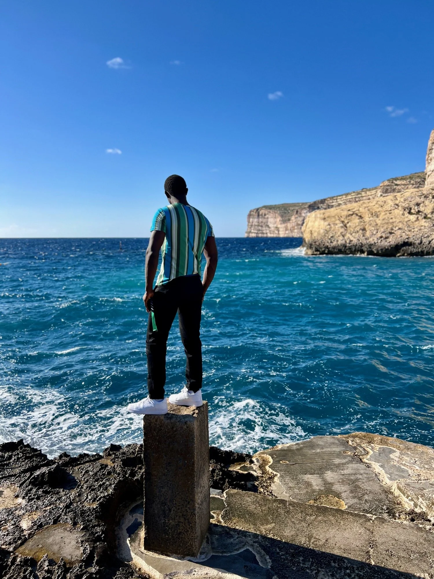 Solo traveller standing on pillar, watching towards the sea and Xlendi cliffs