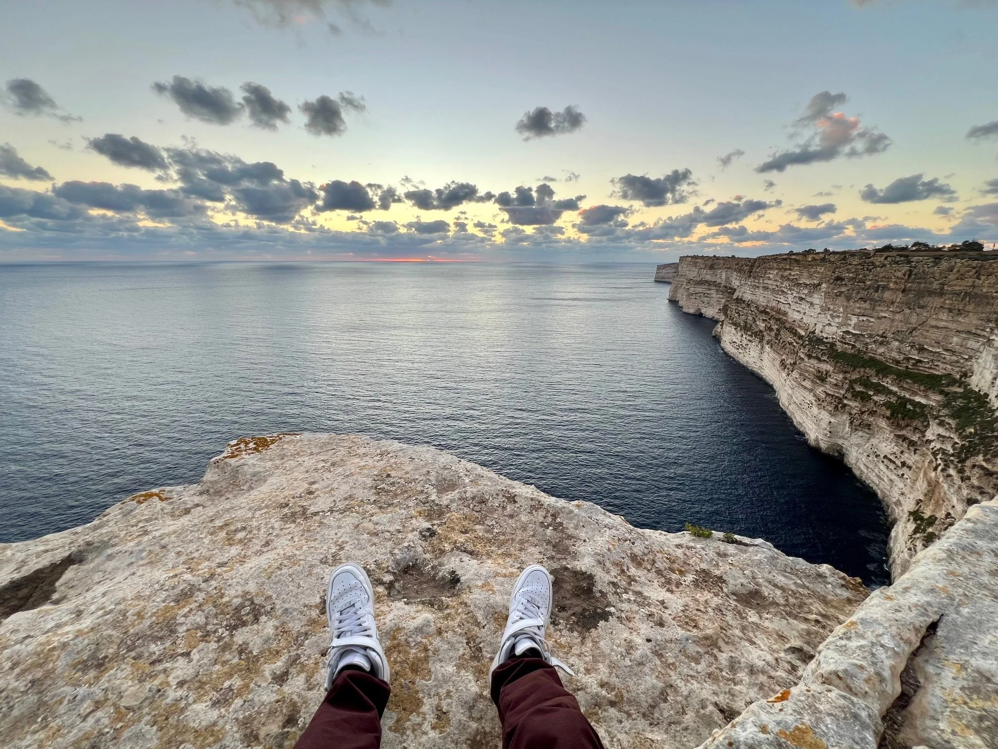 We always walk along the promenade — from the restaurant area until the spot where the bay opens up to the ocean. This is where we met a solo traveller from Barcelona who came to spend a few days in Malta last year in November. We captured his moment of joy as he stood on a little pillar watching the ocean and cliffs of Xlendi.